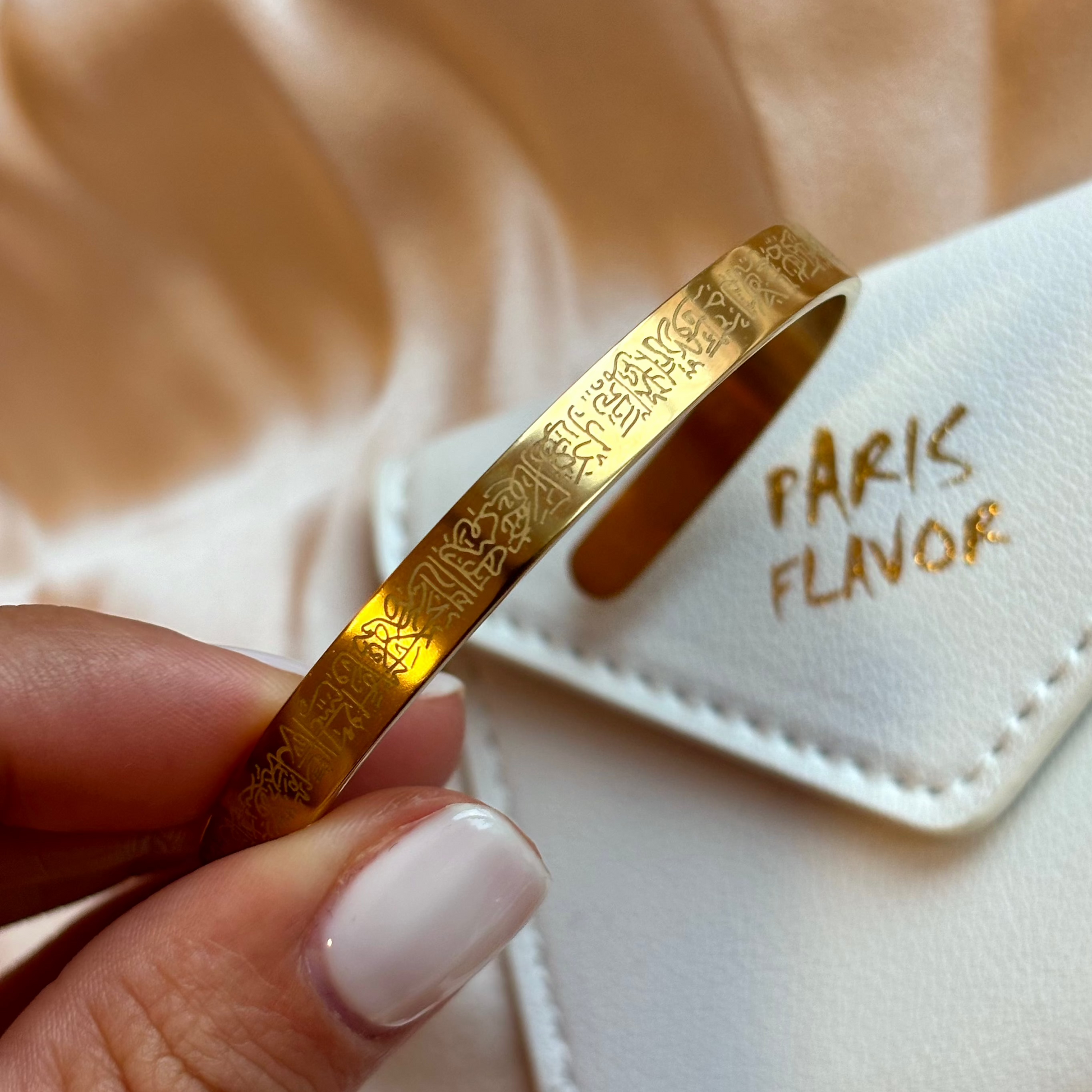 Ce bracelet élégant est gravée avec l'ayat al-kursi, le verset du trône en islam, symbole de protection et de bénédiction. Fabriqué avec soin, il est parfait pour les croyants à la recherche de sérénité et de félicité dans leur vie quotidienne. Un rappel puissant de la foi en Allah et de Sa protection éternelle.
